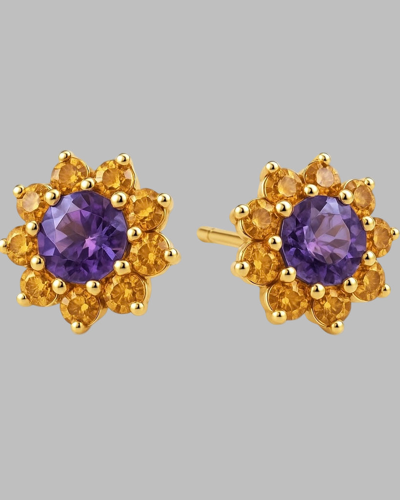18kt Yellow Gold Studs with Intense Purple Amethyst and Citrine Halo.