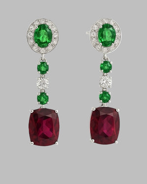 A striking duet of wine-red Rhodolite and deep green Tsavorite, set in 18kt White Gold and illuminated by diamonds—pure, polished opulence.